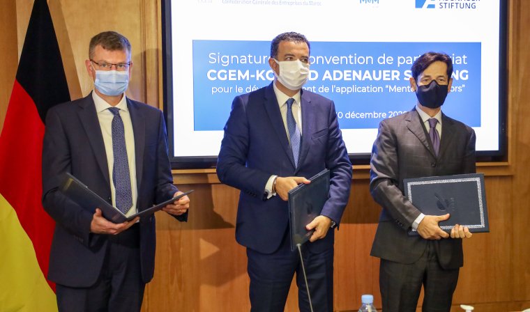 M. Chakib ALJ, Président de la Confédération Générale des Entreprises du Maroc – CGEM, M. Karim AMOR, Président de MeM by CGEM, 13ème région de la CGEM dédiée aux Marocains entrepreneurs et Hauts potentiels du Monde et M. Steffen KRÜGER, Représentant Résident de la Fondation allemande Konrad-Adenauer-Stiftung – KAS, ont procédé, le 10 décembre 2020 à la signature d’une convention de partenariat pour le développement de “Mentoring MeM”.